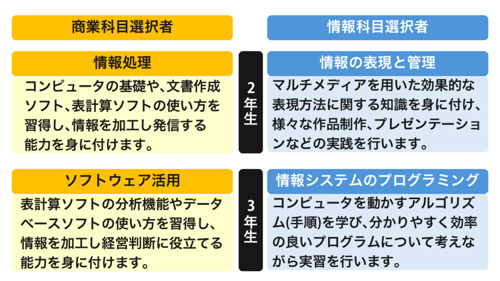 情報ビジネスコースとして、週7時間、専門科目を学びます。2年次に「情報産業と社会」(週3時間)を全員必修とし、商業「情報処 理」、または情報「情報の表現と管理」(各週4時間)のいずれかを学びます。