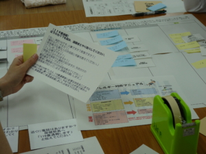 でした。自分の行動を付箋に記入し読み上げながら用紙に張り付けたり、担架やAEDを使用