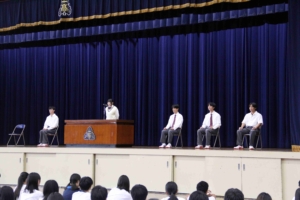 ●立会演説では、6人の立候補者が「一色高校をどんな学校にしていきたいか」というそれぞれの熱い思いを語ってくれました。時には拍手を送りながら、生徒は真剣に演説を聞いていました。